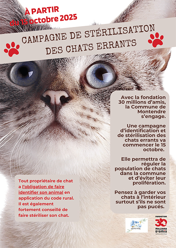 En partenariat avec 30 millions d'amis, la Commune de Montendre lance une campagne de stérilisation et d'dentification des chats errants.