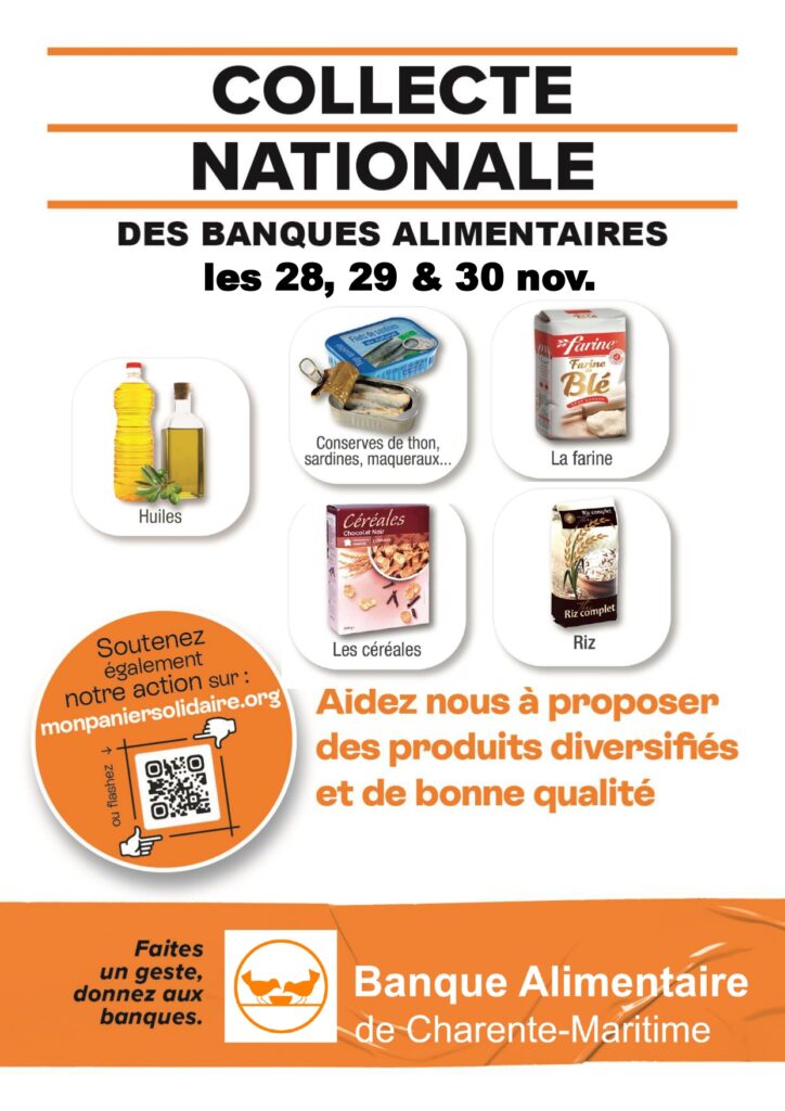 Les bénévoles de l'association Aide et Partage vous attendent pour la grande collecte d'automne de la Banque Alimentaire de la Charente-Maritime, organisée dans vos supermarchés montendrais U Express et Intermarché.