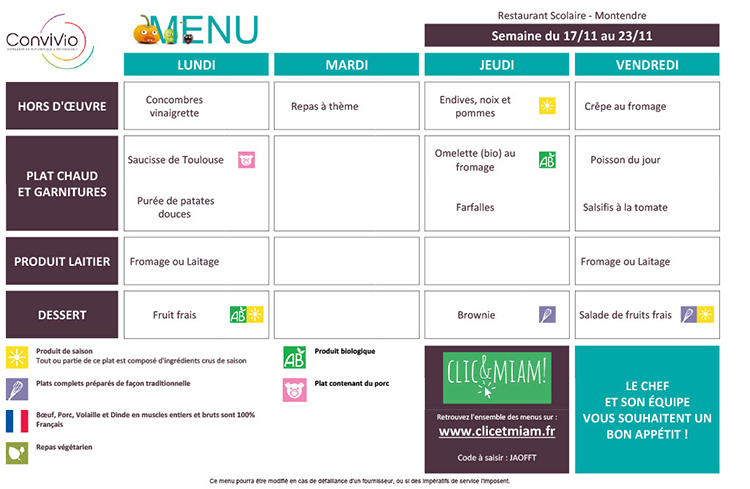 NB : la mairie de Montendre propose une tarification sociale de la cantine scolaire basée sur le Quotient Familial (se renseigner auprès de la mairie et fournir son attestation de QF).