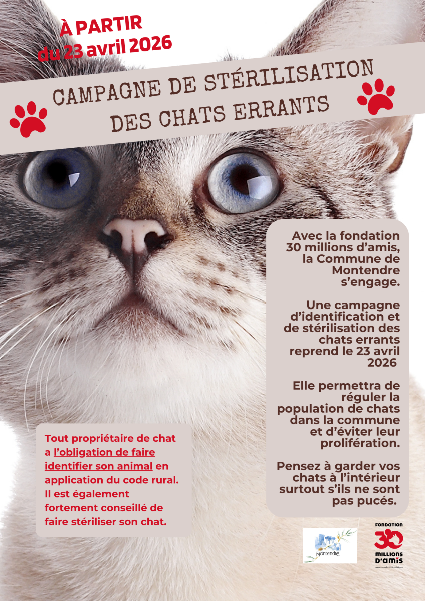 En partenariat avec 30 millions d'amis, la Commune de Montendre pousuit sa campagne de stérilisation et d'dentification des chats errants sur le territoire de la Commune de Montendre.