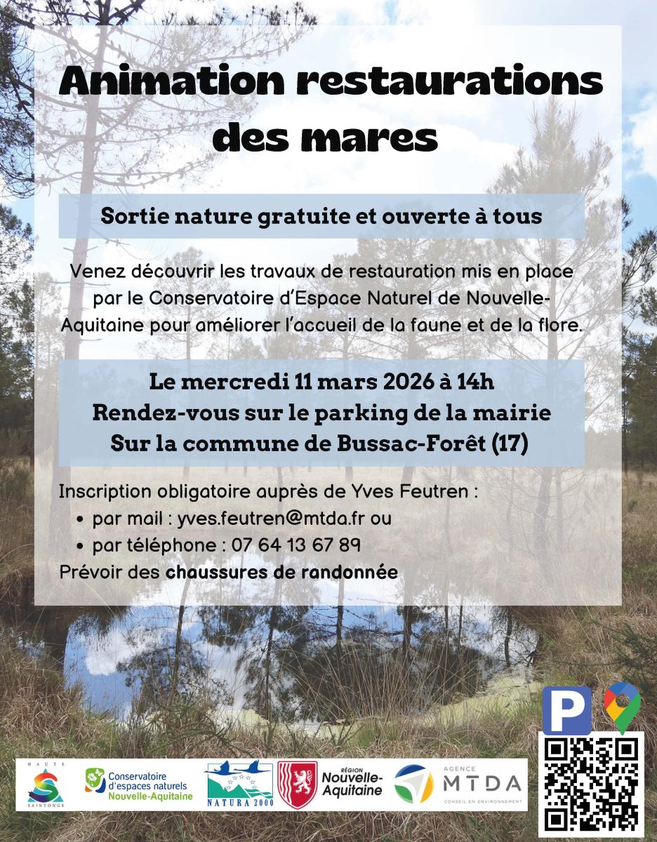 Présentation des actions de restauration des mares réalisées par le Conservatoire d'Espace Naturel (CEN) de Nouvelle-Aquitaine. Sortie animée par Yves Feutren de l'agence MTDA & Clémence MAUCLERC RETIF du CEN.