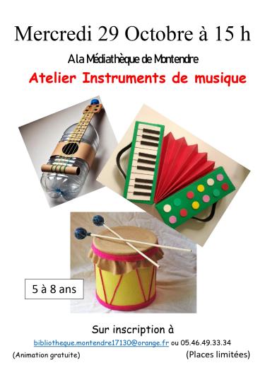 La médiathèque offre aux enfants un atelier de fabrication d'instrument de musique le mercredi 29 octobre à 15h.